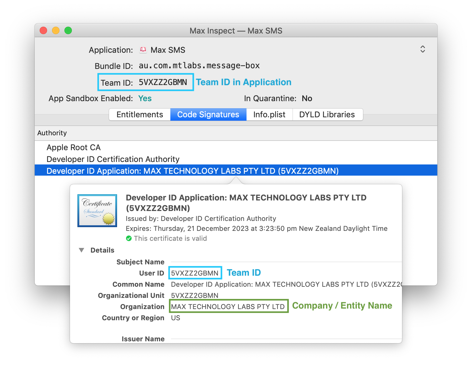 If you find an application that is signed an unexpected entity then it may contain malware. For example, if you find Max Inspect on the internet signed by somebody other than Apple or Max Technology Labs PTY LTD then somebody may of downloaded Max Inspect, injected malware then re-signed it with their own certificate (since they shouldn't have a copy of the Max Technology Labs PTY LTD signing certificates).