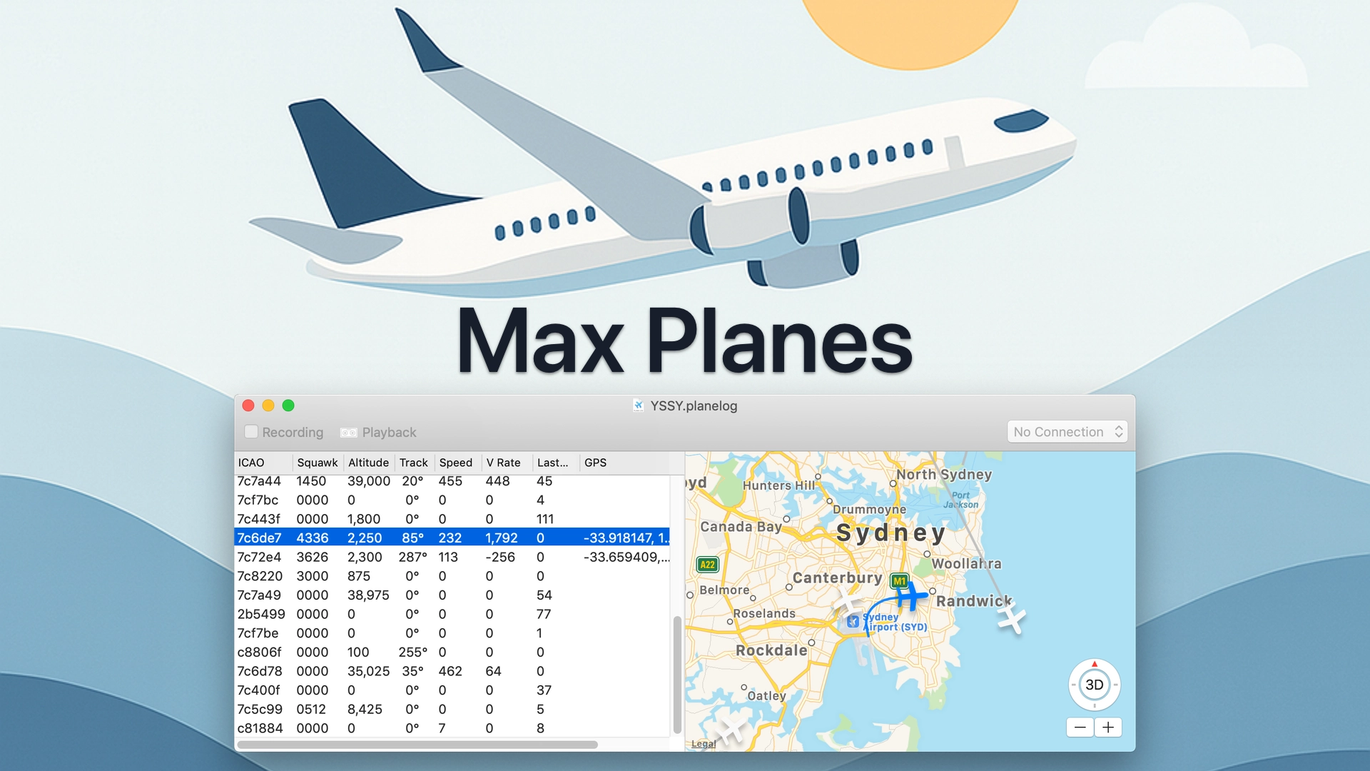 Turn your Mac into a live radar screen! Plug in your RTL-SDR USB dongle and Max Planes paints the sky with real-time aircraft icons, showing callsigns, routes, altitudes, and speeds as aircraft cruise through the skies. Watch live activity, record sessions, and share and replay past flight sessions with others.