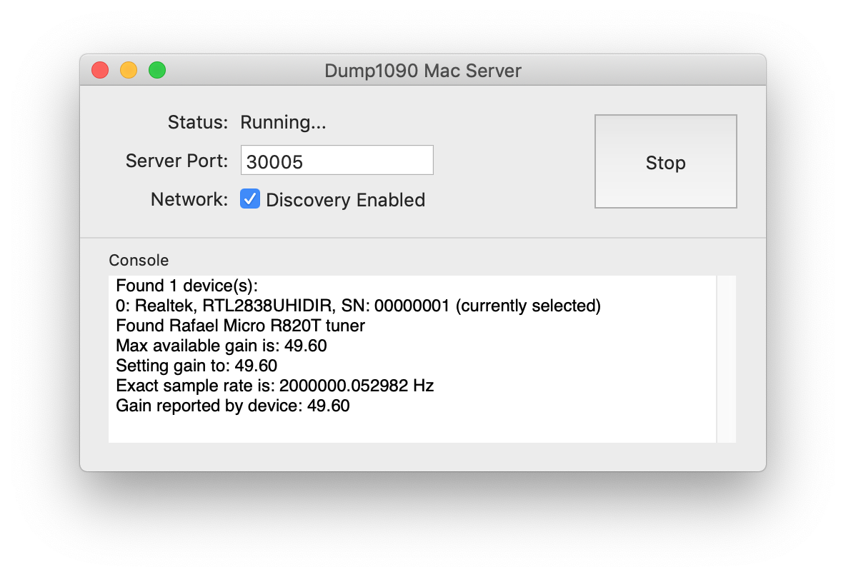 Dump1090 Mac Server is a free and open source standalone Mac App for running dump1090 BEAST format servers, like the one Max Planes needs. Network discovery makes the server visible to other computers via Bonjour.